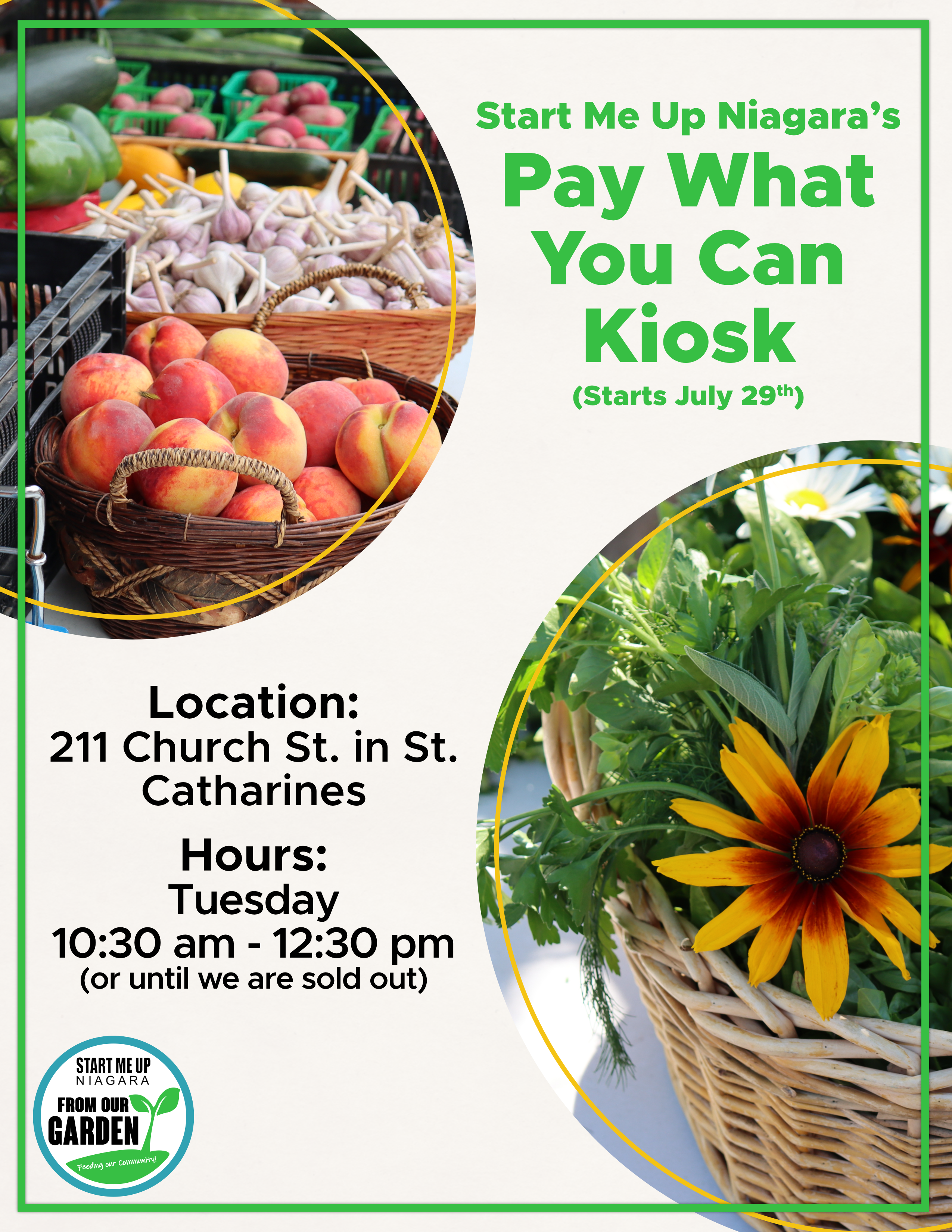 The Start Me Up Niagara garden program brings fresh, local, organically grown vegetables and fruits from the garden to the tables of the people in our community. During the summer months, we run a weekly vegetable stand on Tuesday's in front of 211 Church St. from 10:30 am to 12:30 pm (weather dependant). Pay-what-you-can pricing for low-income community members.